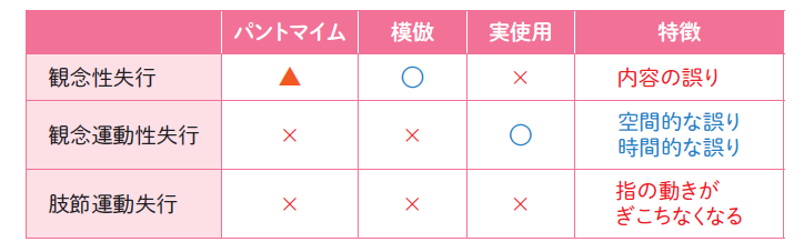 A:そう考えるとわかりやすいです。この患者さんは実使用,パントマイム,模倣の3 つともできなかったから,えーと,肢節運動失行かな。