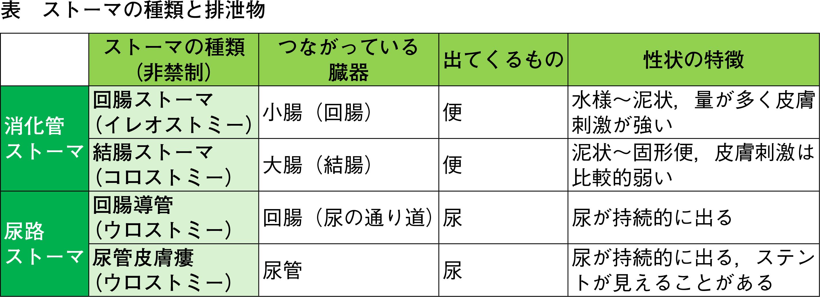 尿や便,ガスを自分の意思で止められる状態を「禁制」と言いますが,今回提示したのは自分でコントロールできない「非禁制」のストーマです。そのためストーマ袋(装具)を使って排出物を受け止め,漏れを防ぐことで,快適な生活を送ることができます。どこにつながっていて,何が出ているかをきちんと理解することは基本中の基本ということです(表)。